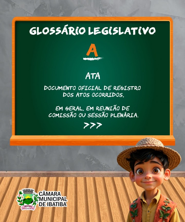 Ata: Documento oficial de registro dos atos ocorridos. Em geral, em reunião de comissão ou sessão plenária.