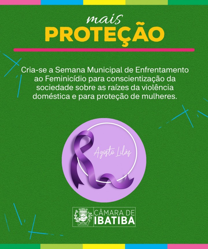 A Câmara Municipal de Ibatiba aprovou a criação da Semana Municipal de Enfrentamento ao Feminicídio, a ser realizada anualmente no mês de agosto como parte das ações da Campanha Agosto Lilás.