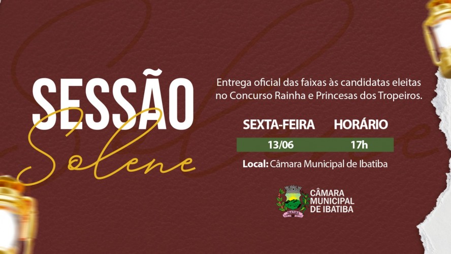 Noticia Câmara Municipal realiza entrega das faixas do Concurso Rainha e Princesas dos Tropeiros nesta sexta (13) Toda a população é convidada a participar da solenidade que acontece às 17h. há 4 meses • Notícia