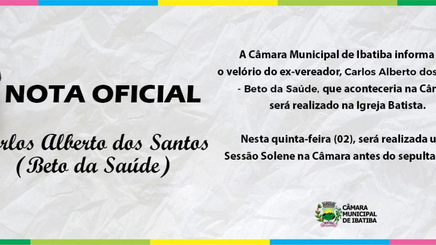Noticia Câmara decreta luto oficial de três dias pelo falecimento do ex-vereador Beto da Saúde Carlos Alberto dos Santos – Beto da Saúde, esteve vereador e presidente da Câmara Municipal de Ibatiba e foi servidor municipal. há 1 minuto • Notícia